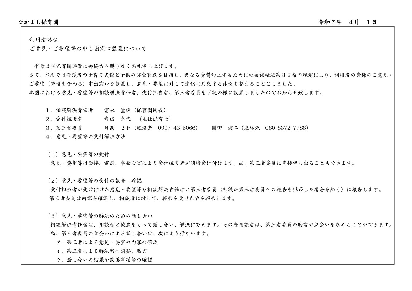 ご意見・ご要望はどの職員でもお伺いいたしますが、受付担当者(主任保育士)と解決責任者(園長、副園長)をそれぞれ設けておりますのでお知らせします。